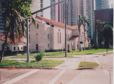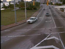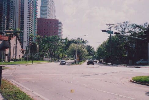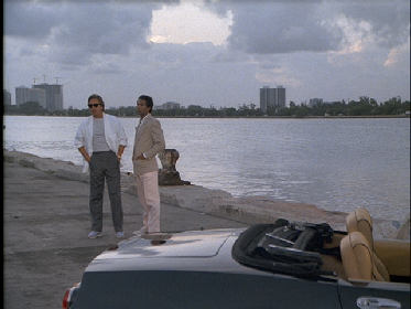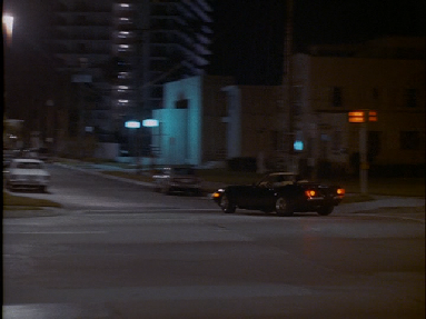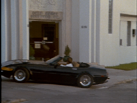 Next we enter into a montage using clips from the pilot of the Daytona driving on Biscayne Blvd. mixed in with Tubbs and Crockett getting ready to go out to the meet. Then at about 21:12 we see new footage of the Daytona. It is headed northbound on Brickell Avenue and turns right onto S.E. 15th Road. St Judes church is seen in the background.