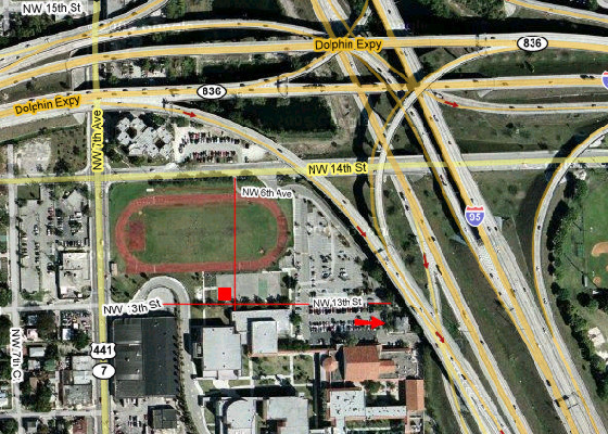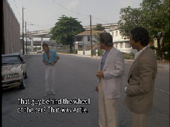 Cut 26 jumps over to mainland Miami to where the teaser was filmed. They start off the cut heading westbound on N.W. 13th Street and turn right (northbound) onto N.W. 6th Ave. Here they stop and let Crockett and Tubbs out at Crockett's car. Thanks to DanJ for finding this location and letting me use his location pictures.