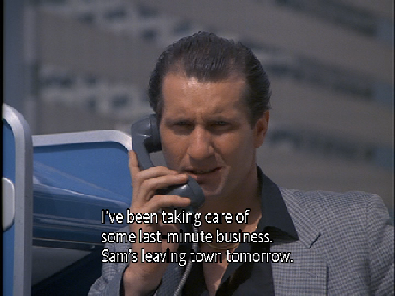 After finding Artie's place cleared out they return to Crockett's boat. I love this scene with Elvis, classic Vice. Then they receive a call from Artie. For a long time I thought this was filmed outside the Storer Communications building at 12000 Biscayne Blvd. Thanks to Airtommy at Miamiviceonline.com we now know that this was not the case. He figured out that it was in fact filmed on Brickell Avenue at 8th Street. Artie is on the SW corner of the intersection closer to 8th Street. We see the Suntrust building behind him with the Four Ambassadors (of Tony Rome fame) seen reflected in the windows. Artie is in front of what was the Barnett Bank Centre at 800 Brickell Ave.