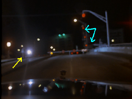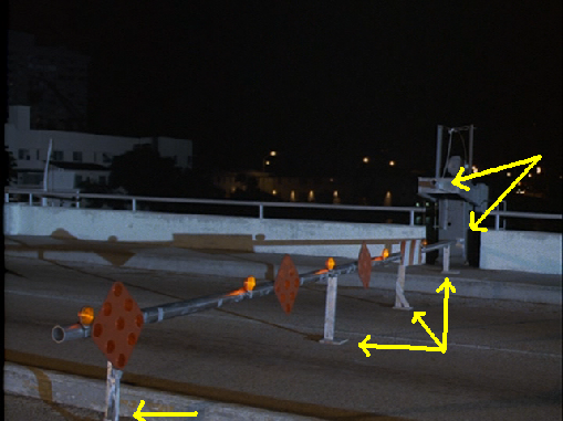 In the picture below the yellow arrow points to the cameraman. The light blue arrows point to the raised, real gate on the east end of the bridge and the gate's mechanism arm missing the gate with the gate set up at a lower level for the car to hit.