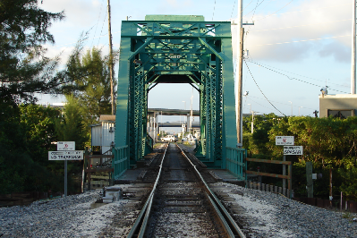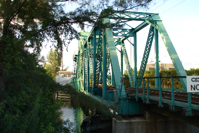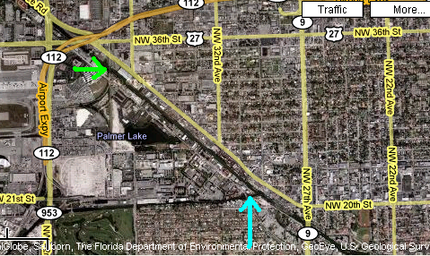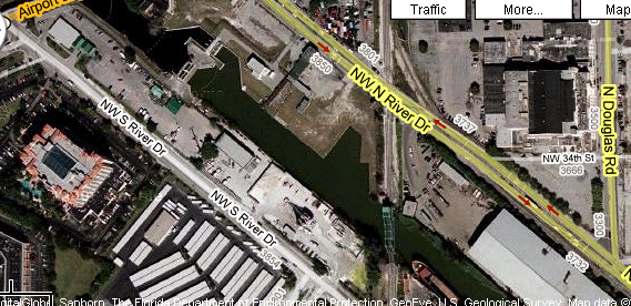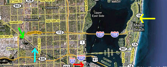 The picture above relates all four shooting locations for the boat vs. car chase. The drug deal (blue arrow), the end at the RR bridge (green arrow), the main boat chase sequence (yellow arrow), and where Crockett stops when Tubbs turns after the barge (red arrow).