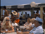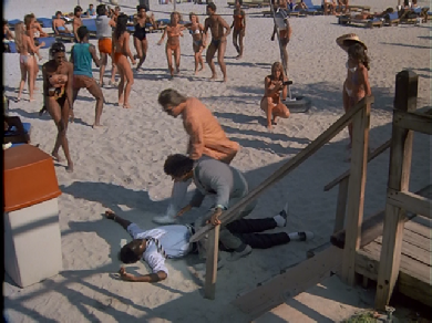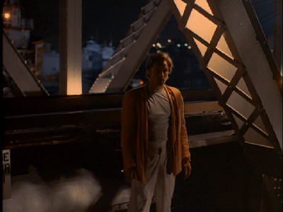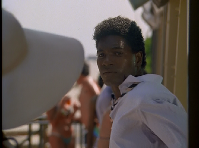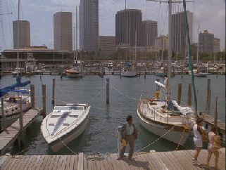 Next, Tubbs pays Crockett a visit on the St. Vitus Dance. Crockett’s Govt. issued sailboat that he uses as his home base. In the first two seasons of Miami Vice, Crockett keeps both of his boats tied up here, at the Miami Marina, Bayside. In this capture you can see what is now the Hard Rock cafe in the background. You don't see Bayfront Marketplace because its not there yet. It was built during the first two seasons of Miami Vice and varying stages of construction can be seen in different episodes.