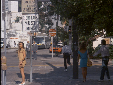 If while watching this scene you follow the woman in the tan dress you see in the above picture until she gets to the street corner in the picture below it will make you laugh. She starts out walking up the steps to the corner where there is no door or anywhere else to go, she stops looks back at the camera and waits for her mark then turns and walks back down the stairs behind Leon. Then although it looks like a flawless one piece sequence there had to have been a cut and another take because all of a sudden she is ahead of Leon.