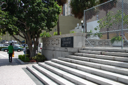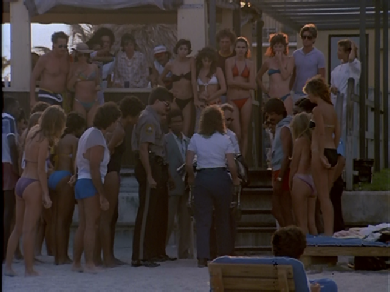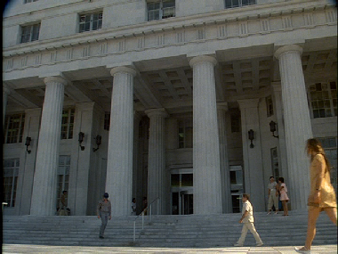 This next scene is interesting. I watched this movie several times before I realized that the opening of the scene, seen in the picture below is from the same piece of film as the close. They start on the outside of the Dade County Courthouse with extras walking by. They cut to the interior of the courtroom which is on the 6th floor as revealed by the room numbers on the doors. Then as the scene closes, Leon goes bursting out of the courthouse and the same extras are walking in the same place as at the start of the scene. They just cut the film and added the interior scene in between.