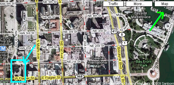 The light blue box surrounds the Dade County Courthouse. Leon exits the north side center and walks north east. The green arrow points to Crockett's marina.