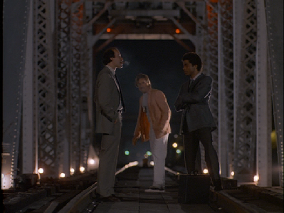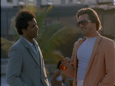 As Tubbs passes under a railroad bridge Crockett is already there waiting, he jumps into his boat and it’s the start of a beautiful relationship.