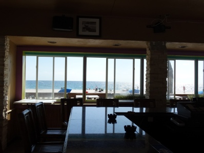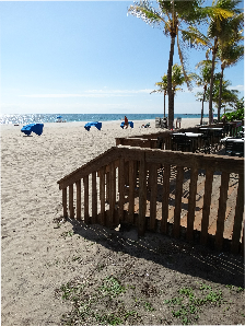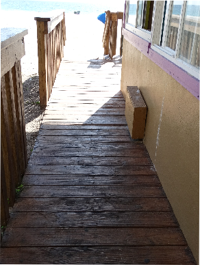 The new bar extends about 6 feet further north so that the old boardwalk that runs to the beach where we see C+T walk down toward Leon is now actually inside the bar. The spot where we see Leon standing is now at the corner of the new bar.